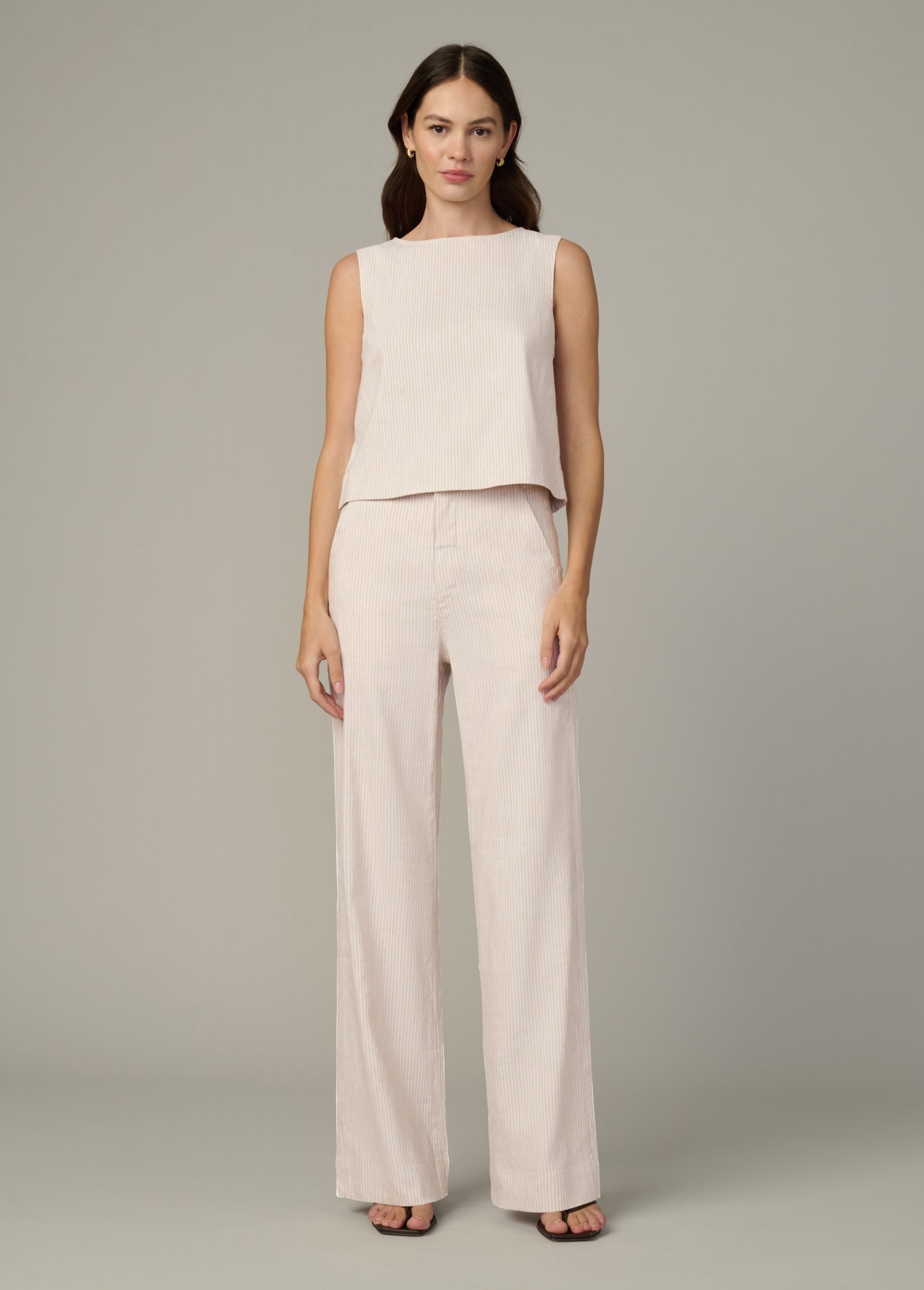 Comfort-linen blend in a neutral-tone, micro-striped pattern.