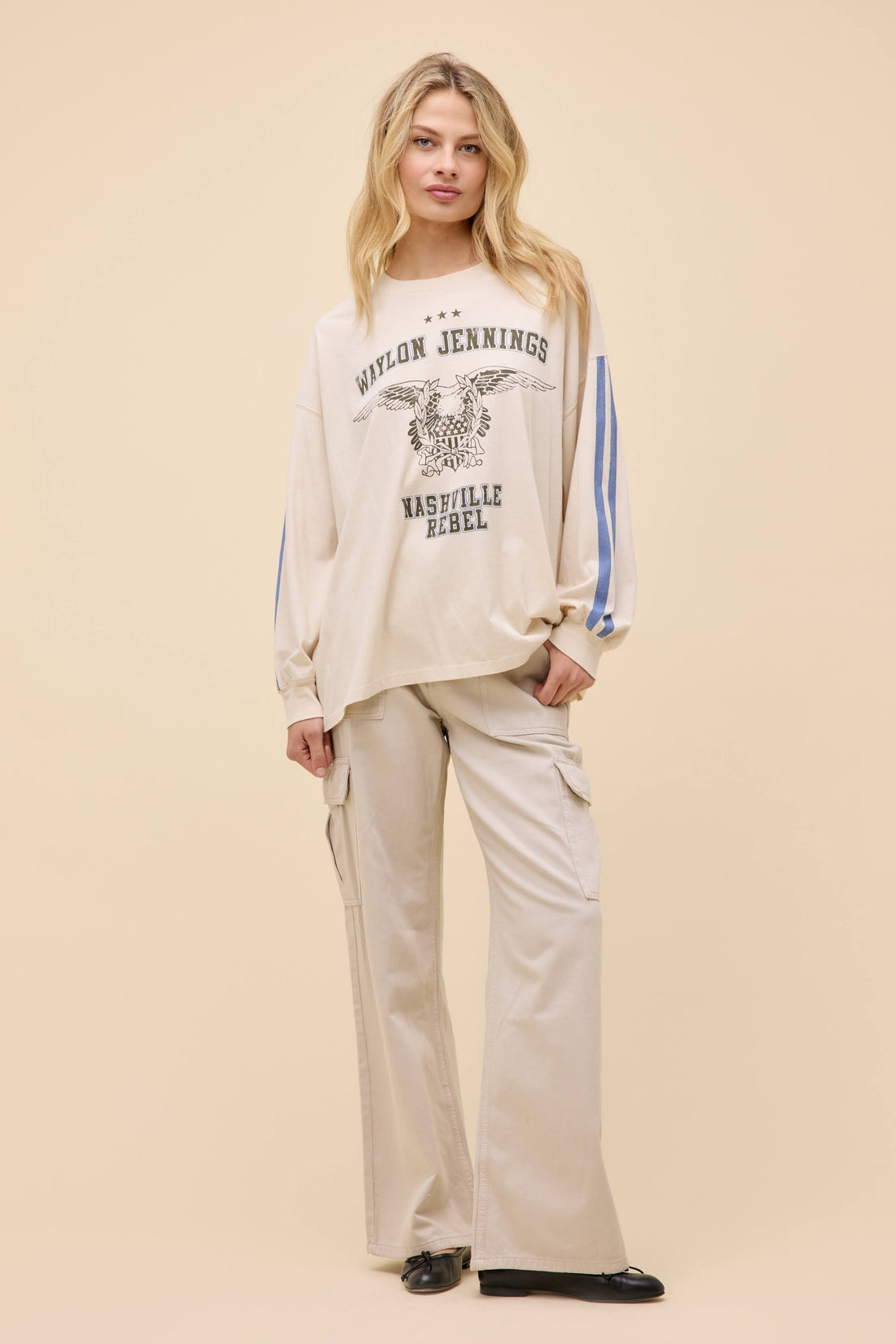 The originator of the Outlaw movement, Waylon Jennings, hits this OS Long Sleeve that gives a nod to the gritty star's rebellious country sound. Stamped with the icon's name, an eagle emblem and a shoutout to his hometown. Designed with double sleeve stripes and star accents for a collegiate influence.