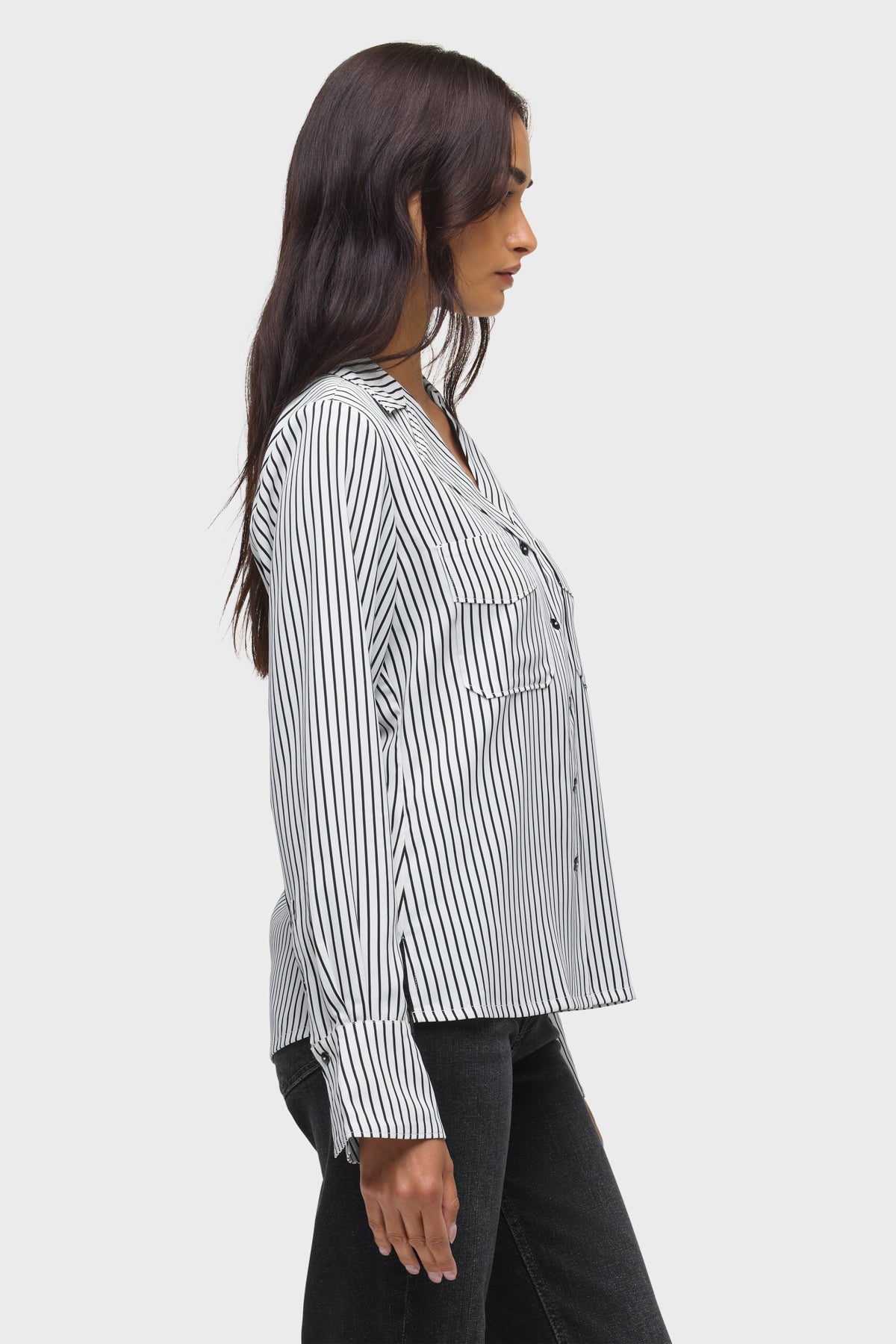 modern closet classic. The Long Sleeve Camp Shirt in Black Bengal Stripe is a slim-fitting shirt, featuring slits at the side seams and camp collar styling.