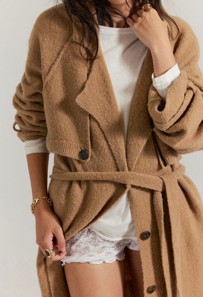 A classic trench silhouette, now in a cozy wool knit fabrication. This maxi-length cardi from We The Free features notched lapels, a storm flap accent, slouchy sleeves, and button closures.