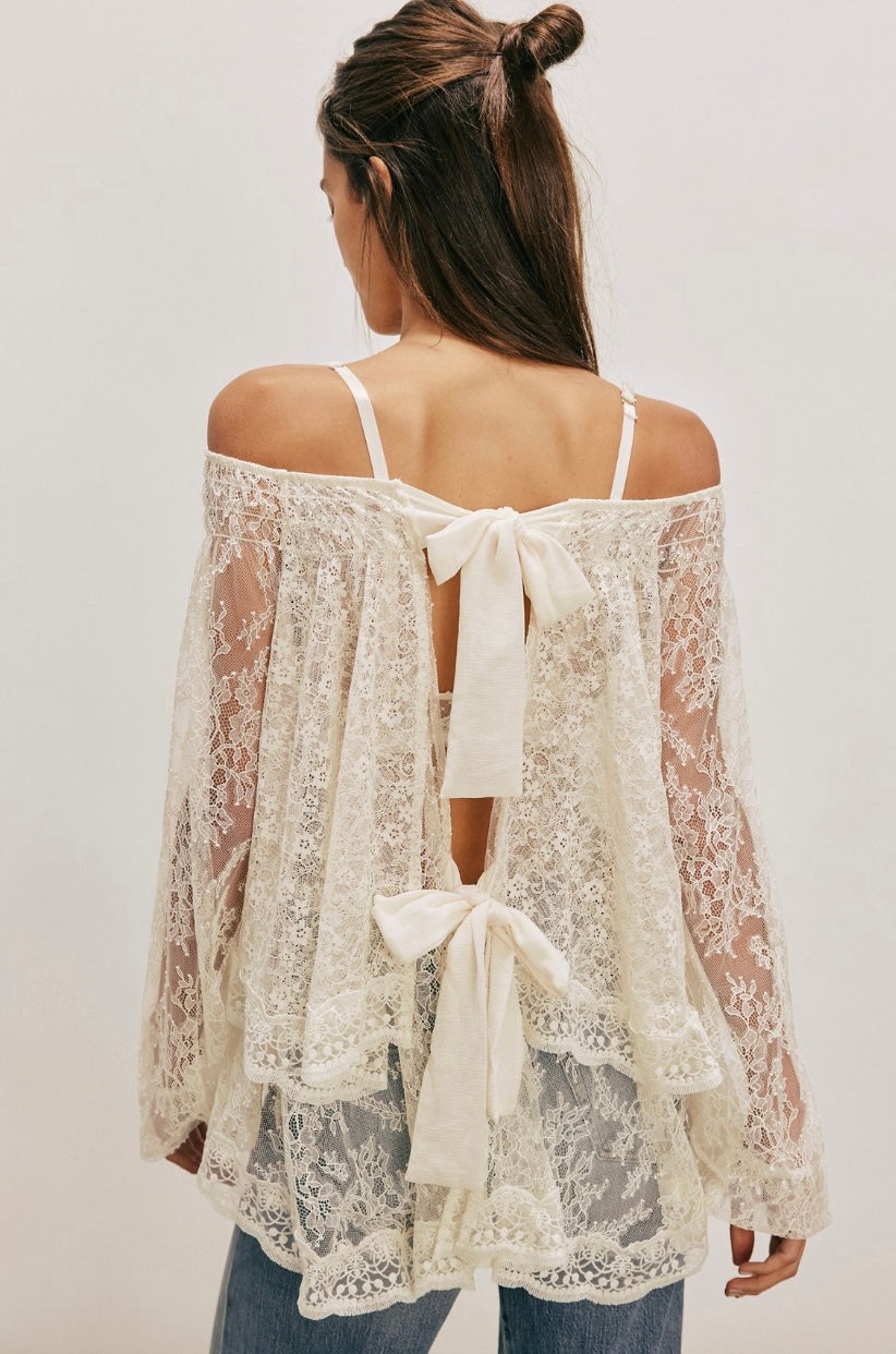 Features: Sheer lace fabrication, off-the-shoulder neckline, balloon sleeves with elasticated cuffs, self-tying back closures, layered design with contrast trim, unlined Why We O It: This lace top can be worn with the bows in the front or back for effortlessly versatile styling.