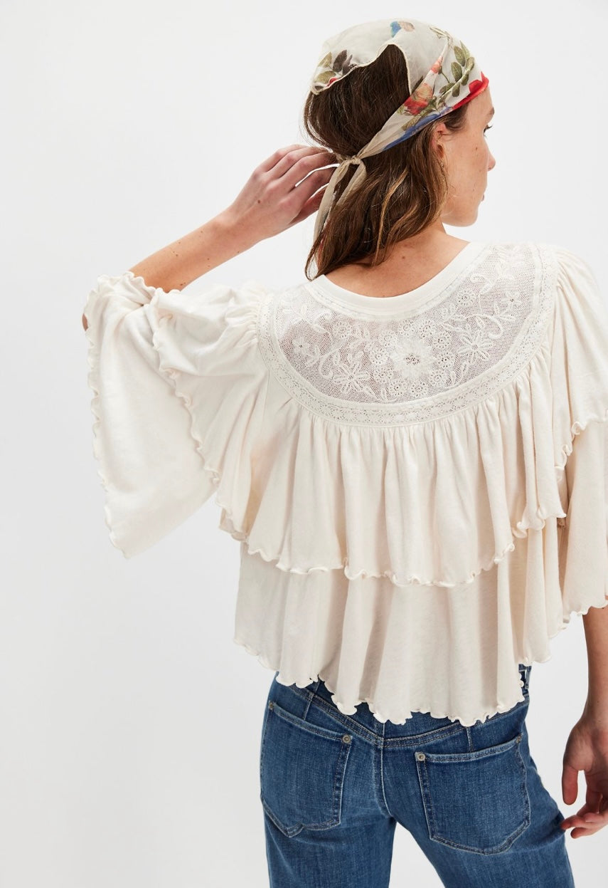 It's so easy to fancy this elegant tee, featured in a unique tiered design and classic cotton jersey fabrication with ruffled sleeves, lettuce-edge trim, and delicate embroidered mesh panels.