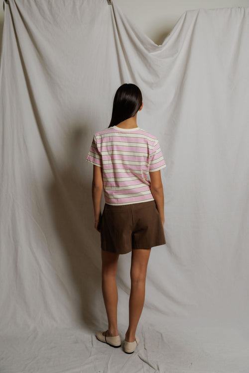 the gia is the tee sister to our favorite daria rugby. made from the same structured cotton knit, it trades the collar for a clean crew neck and swaps the long sleeves for a classic short sleeve. it features the same bold, vintage-inspired stripes and an easy, slightly cropped silhouette that makes it an instant go-to for warmer days.