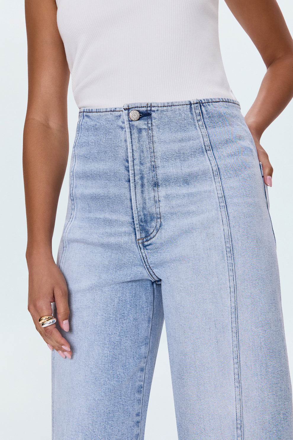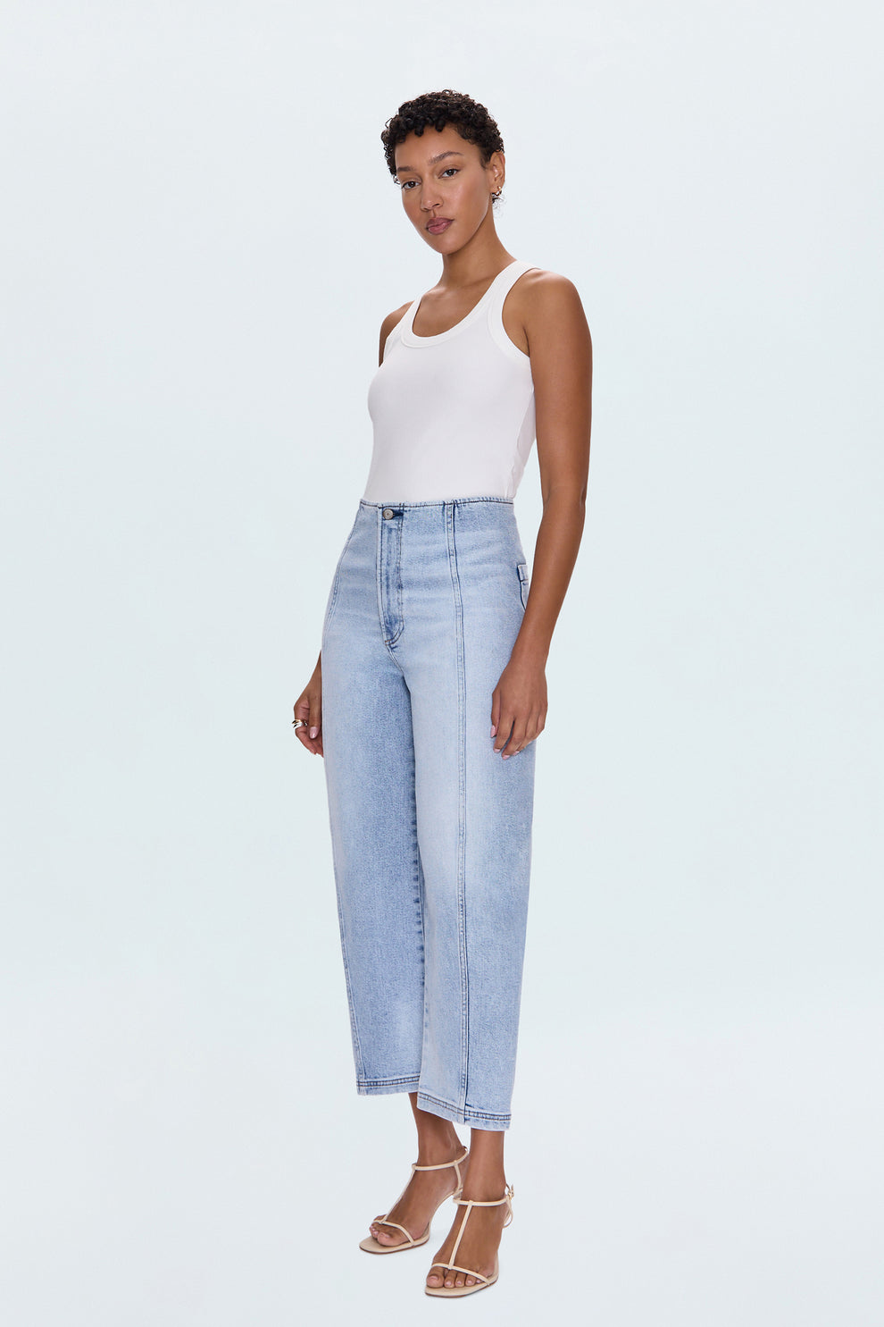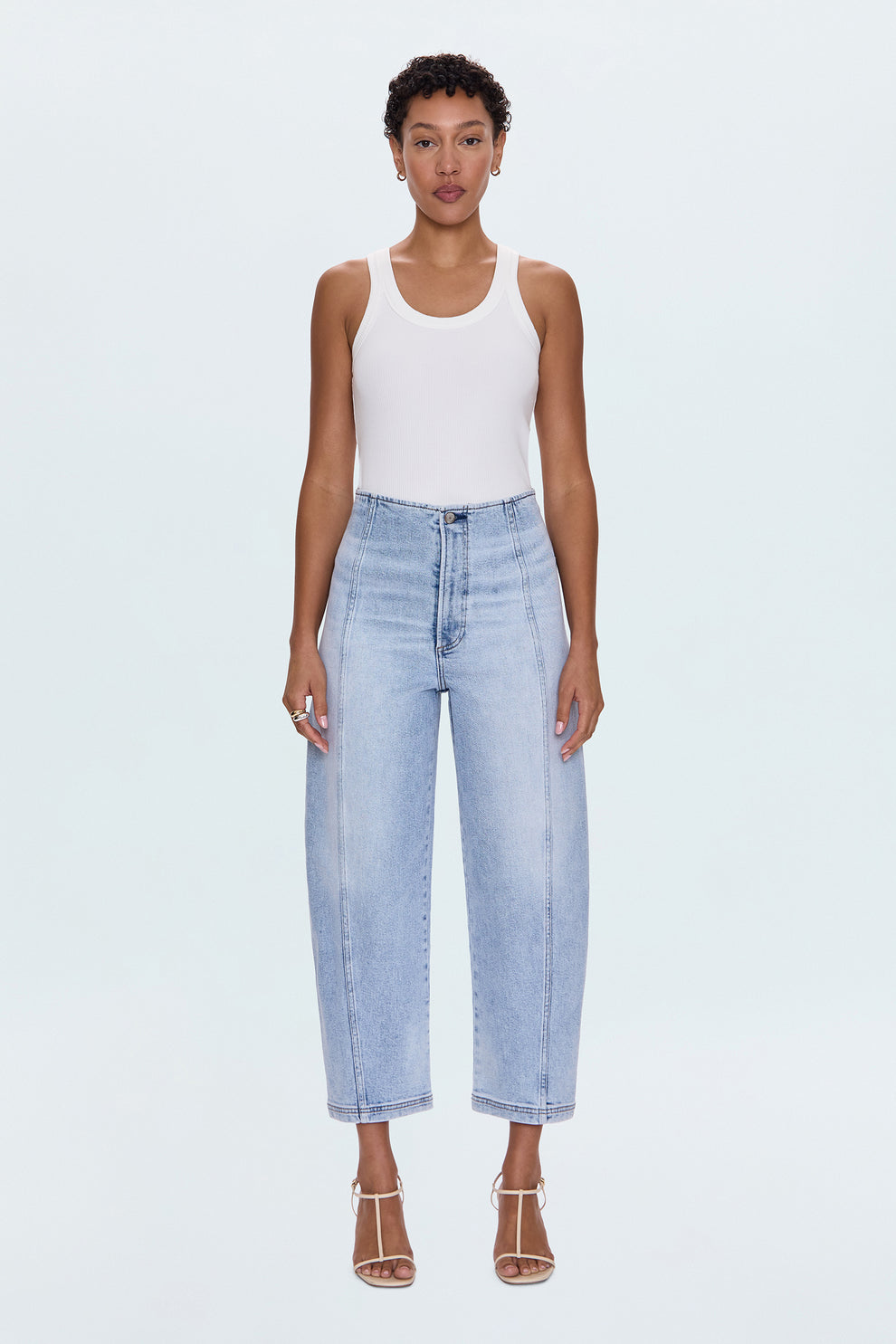 Meet your new favorite denim: our High-Rise Barrel/Balloon Leg jeans. The unique shape offers a modern twist, while the absence of a waistband creates a smooth, streamlined silhouette that feels inherently sophisticated. Notice the chic seaming details - a thoughtful touch that adds an elevated flare.