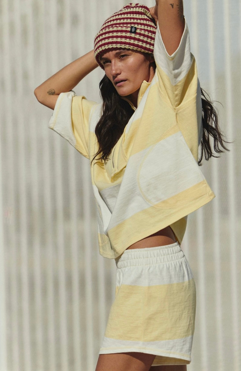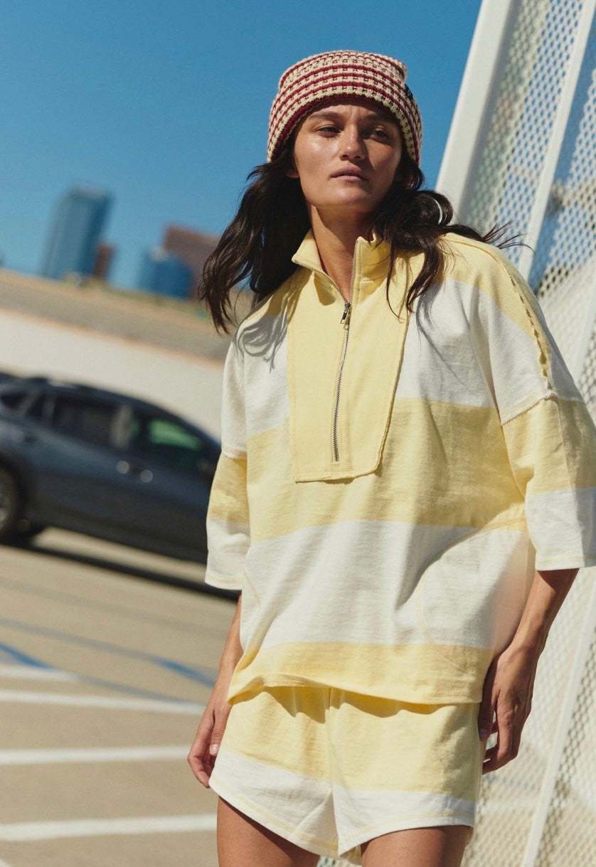 Features: Top: Front quarter-zip closure, striped pattern throughout, dropped shoulder seams, side pockets;