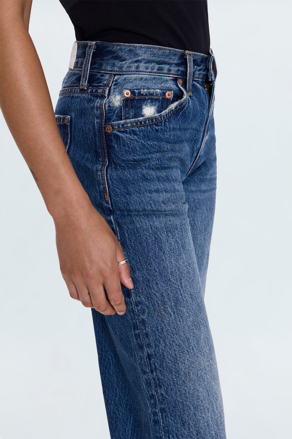 Mid-rise, with a straight leg that bows at the knees for an arched, barrel leg silhouette. Ankle length crop with a clean hem. Artisan is an ultra cool dark wash with gentle fading around the knees and thighs.