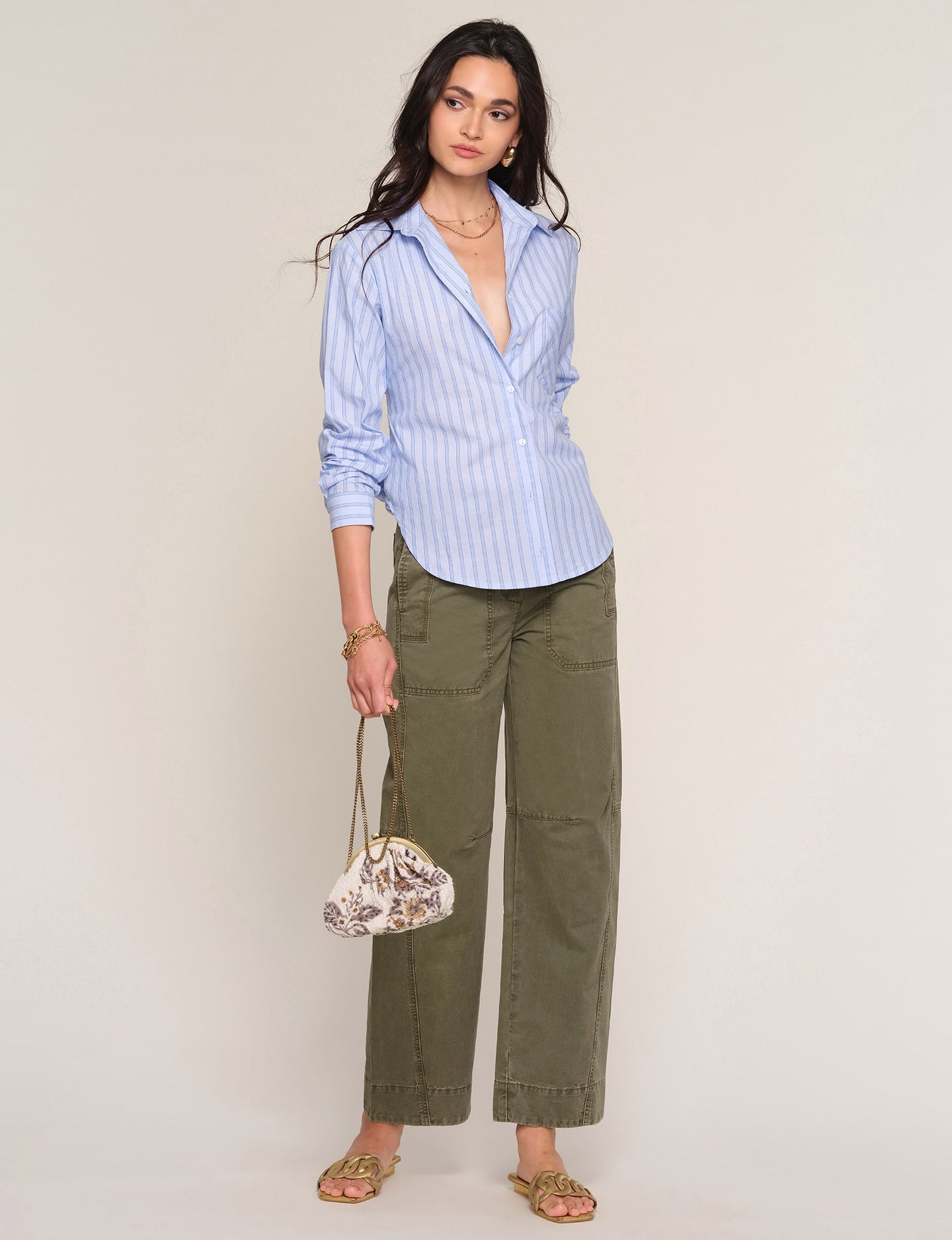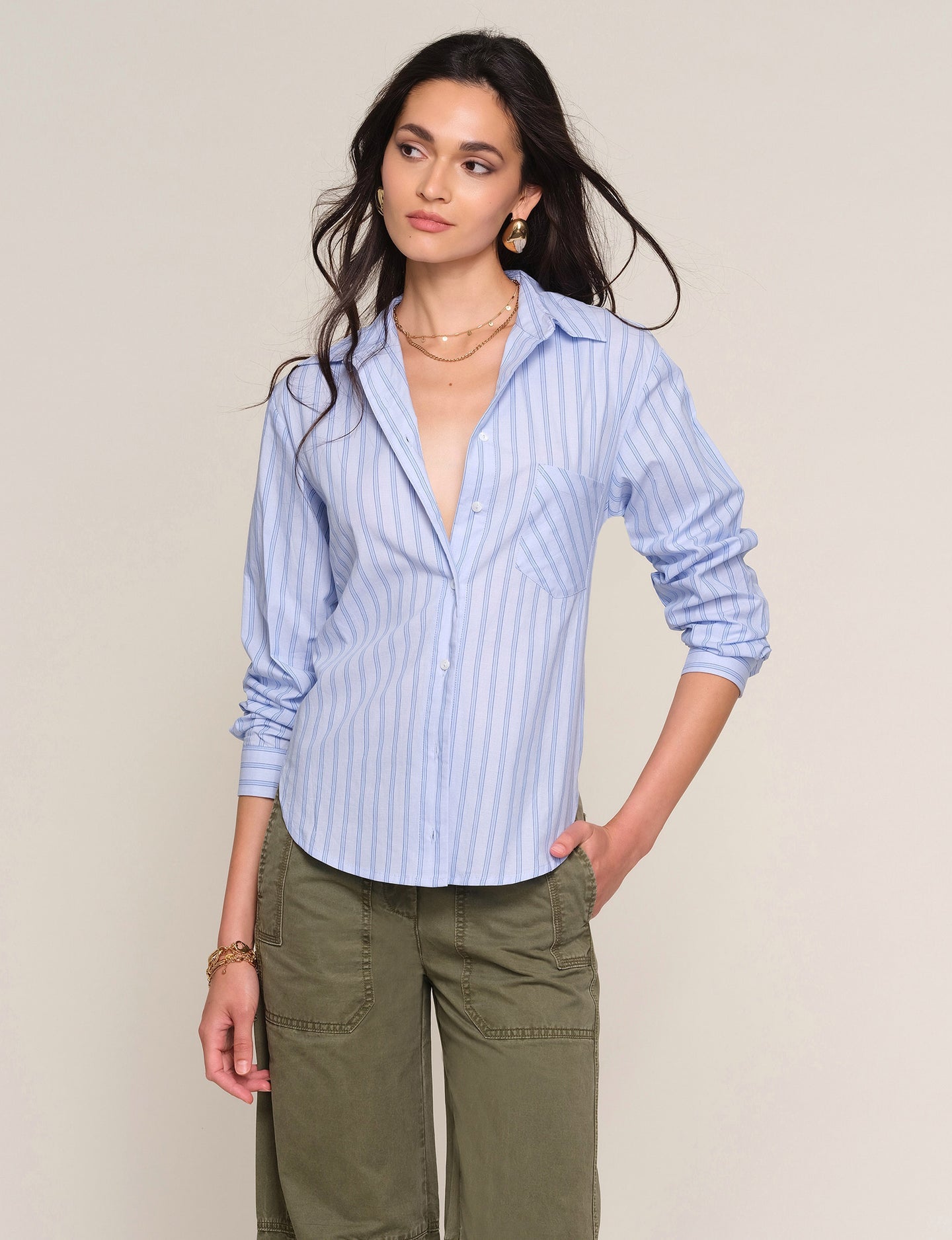 The Timothy Top is a cool, slim fit, button down shirt. Made from a washed, cotton, yarn-dye stripe, it pairs perfectly with denim. It features a back opening with self tie.